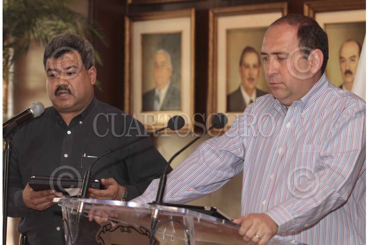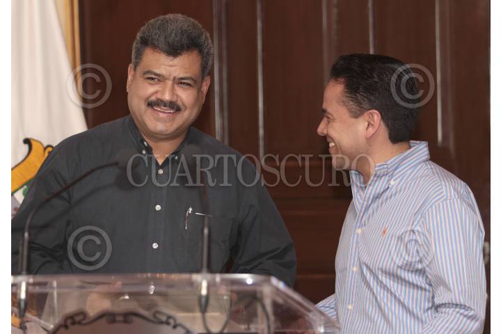 SALTULLO, COAHUILA, 07MARZO2012.- Domingo González Favela junto a Ruben Moreira Veldez, gobernador del estado durante la conferencia sobre los acontecimientos ocurridos ayer en el municipio de Piedras Negras y la mañana de este miércoles en Saltillo entre autoridades y civiles armados donde resultó una agente muerta y ocho lesionados, además de que dos delincuentes fueron detenidos. FOTO: KARLA ITZEL RUIZ /CUARTOSCURO.COM