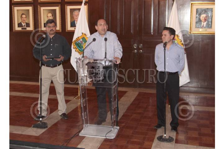 SALTULLO, COAHUILA, 07MARZO2012.- Domingo González Favela junto a Ruben Moreira Veldez, gobernador del estado y el vocero de seguridad del Estado, Segrio Sisbeles durante la conferencia sobre los acontecimientos ocurridos ayer en el municipio de Piedras Negras y la mañana de este miércoles en Saltillo entre autoridades y civiles armados donde resultó una agente muerta y ocho lesionados, además de que dos delincuentes fueron detenidos. FOTO: KARLA ITZEL RUIZ /CUARTOSCURO.COM