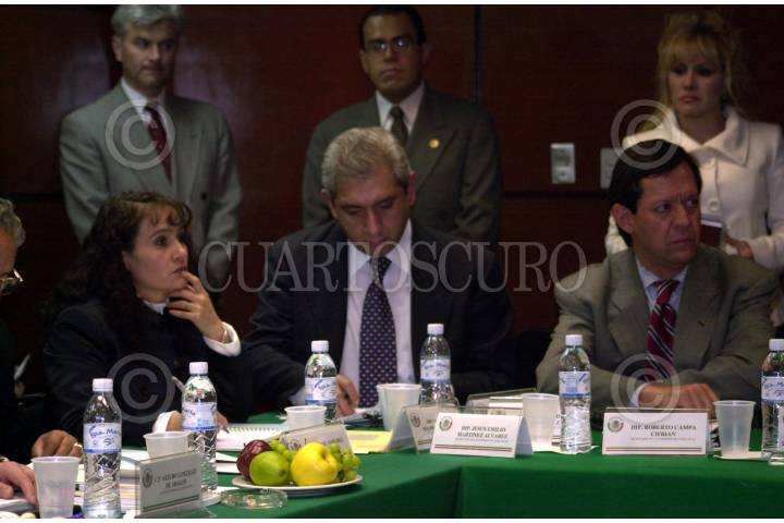 México D.F. 21 ENERO 2004.- La diputada perredista Dolores Padierna (izq) y el priísta Roberto Campa (der) durante la reunión de trabajo que sostuvieron con Arturo González de Aragón, auditor superior de la federación en San Lázaro. FOTO: Sandra Perdomo/CUARTOSCURO.COM