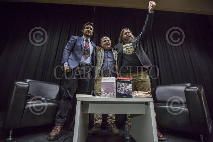 TIJUANA, BAJA CALIFORNIA, 15FEBRERO2019.- Vicente Alfonso, Federico Campbell Peña, hijo del escritor y Daniel Salinas Basave, durante el Homenaje In Memoriam del narrador tijuanense Federico Campbell, a cinco años de su ausencia, realizado en el Centro Cultural Tijuana. FOTO: OMAR MARTÍNEZ /CUARTOSCURO.COM