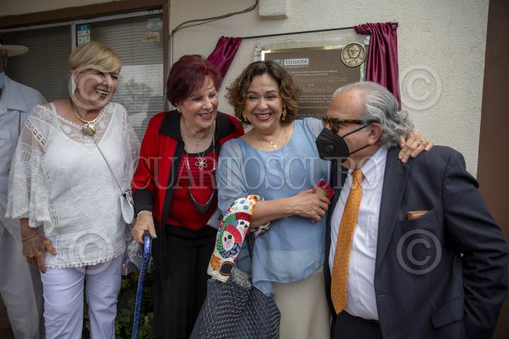 Silvia Campbell, Carina Campbell, Carmen Gaitán Rojo, viuda de Federico Campbell Quiroz y el Secretario de Cultura de Baja California, Pedro Ochoa, durante la develación de una placa conmemorativa del 80 aniversario de nacimiento del escritor.