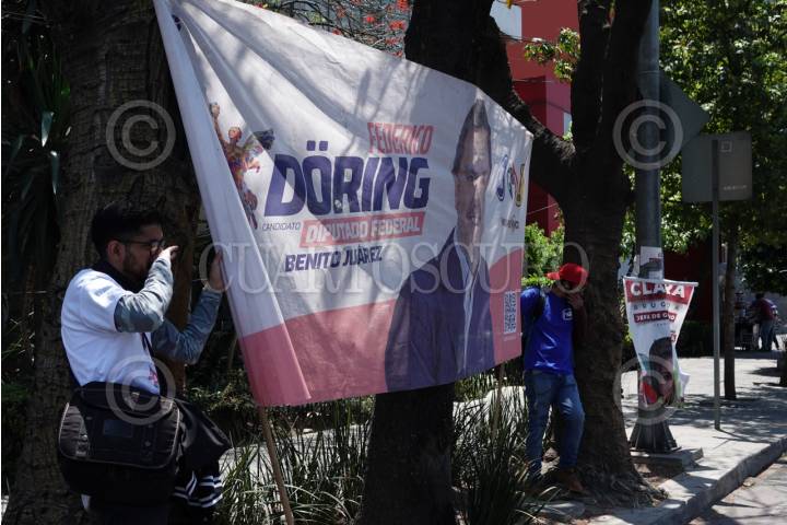 CIUDAD DE MÉXICO, 26MARZO2024.- Jóvenes sostienen una publicidad de Federico Döring como candidato a Diputado Federal, en calles de la alcaldía Benito Juárez. FOTO: GALO CAÑAS/CUARTOSCURO.COM