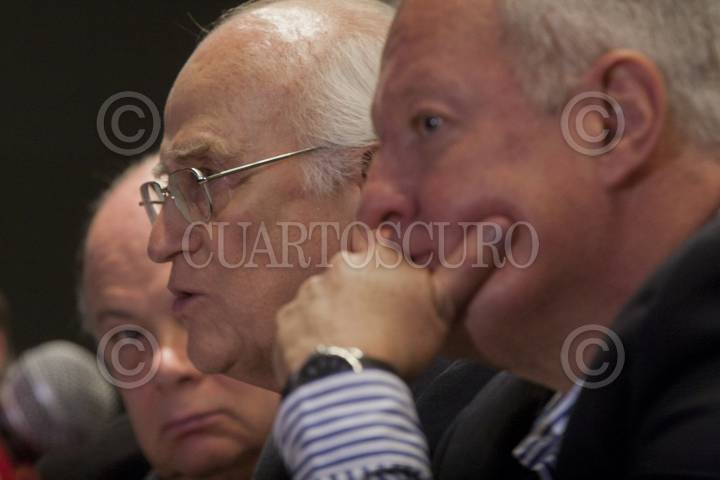 MÉXICO, D.F., 17ABRIL2013.- Jesus Reyes Heróles y Enrique Krauze pendientes a los proyectores, durante el Homenaje y presentación de la pagina de internet de Miguel de la Madrid Hurtado en el Fondo de Cultura Económica. FOTO: ALEJANDRO NEYRA /CUARTOSCURO.COM