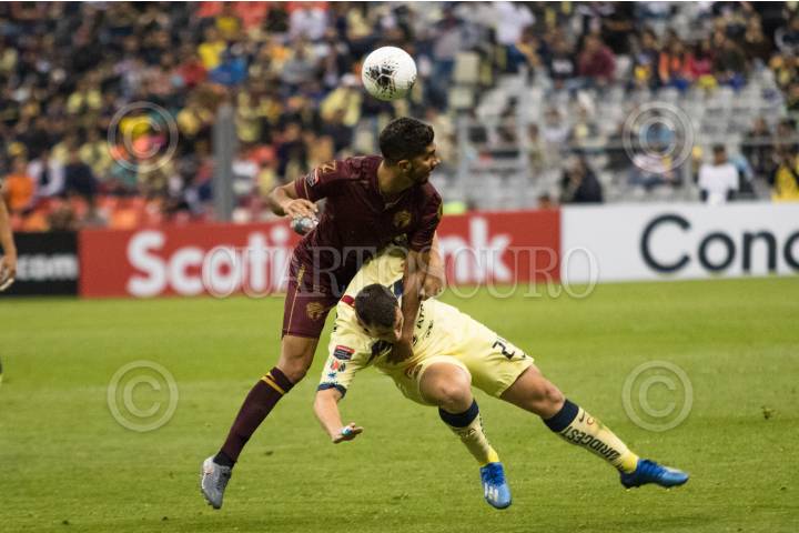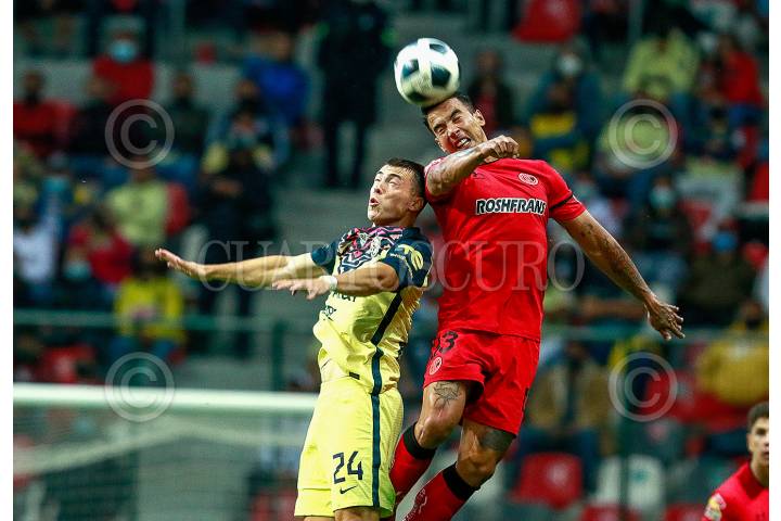 Diego Rigonato medio de los Diablos Rojos del Toluca y Federico Viñas delantero del Club América disputan el esférico durante el partido en el estadio Nemesio Diez.