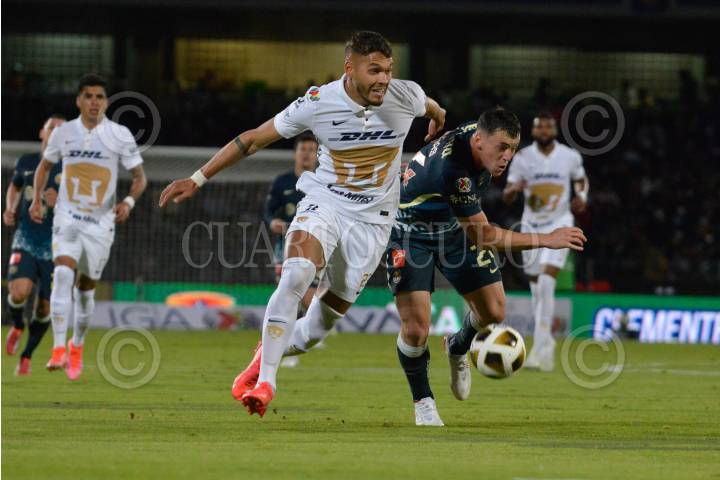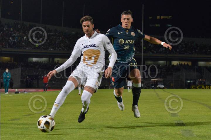Nicolás Freire, defensa central de los Pumas, disputa el balón frente a Federico Viñas, delantero del América durante el partido de ida de los cuartos de final de la Liga MX Apertura 2021. Marcador final: Pumas 0 - 0 América.