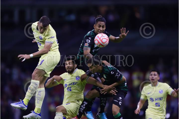 Remate de Federico Viñas para empatar el marcador 3-3 durante el partido de fútbol América vs Santos correspondiente a la jornada 5 del Torneo Apertura 2022 de la Liga BBVA MX, en el estadio Azteca.