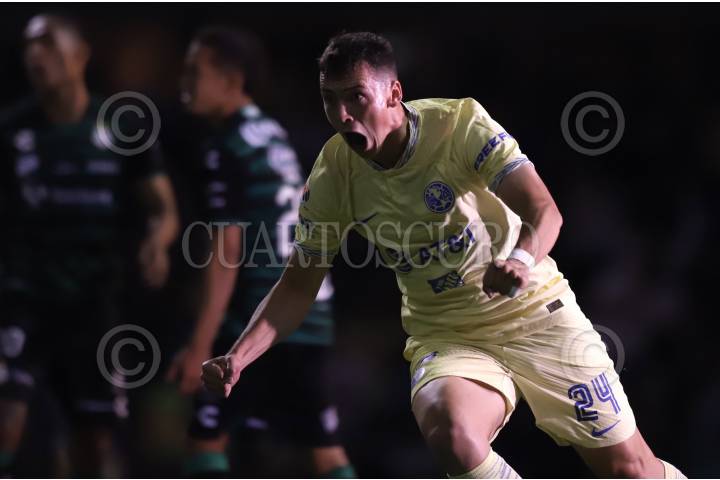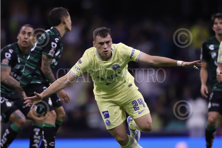 Festejo de Federico Viñas tras empatar el marcador 3-3 durante el partido de fútbol América vs Santos correspondiente a la jornada 5 del Torneo Apertura 2022 de la Liga BBVA MX, en el estadio Azteca.