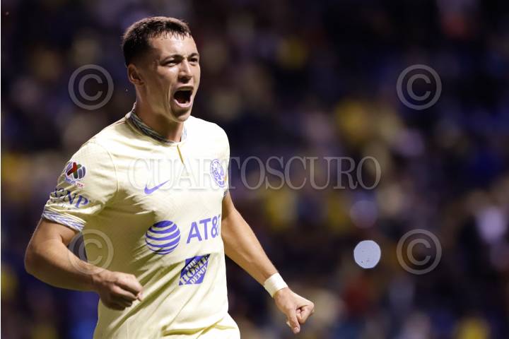 Federico Viñas en festejo de gol durante el partido entre en el Club Puebla y las Águilas del América correspondiente a la ida de los Cuartos de Final del torneo Apertura 2022 de la Liga BBVA MX, celebrado en el estadio Cuauhtémoc.
