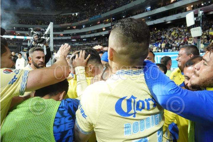 Jugadores del equipo del América celebraron el gol del delantero centro Federico Viñas, durante el partido contra el Monterrey en el Estadio Azteca