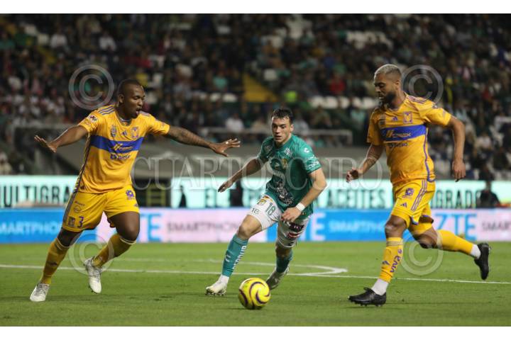 LEÓN, GUANAJUATO, 17ENERO2024.- El León cayó ante el Tigres 2-1, por parte de los esmeraldas anotó Ángel Mena, mientras que para los universitarios contribuyeron Francisco Sebastián Córdova y André-Pierre Gignac. Partido correspondiente a la jornada 1 de la Liga MX, y realizado en el Estadio León. En la imagen Federico Viñas de León intenta penetrar en el área chica defendida por los Tigres. FOTO: JORGE ORTEGA/CUARTOSCURO.COM