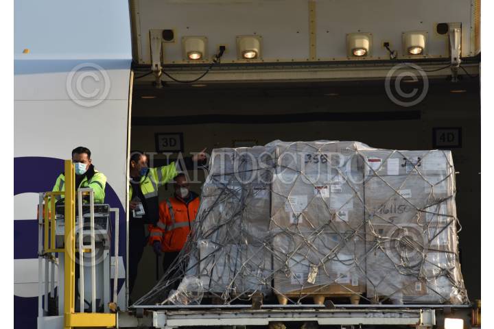 El ejército vigila la llegada del cargamento de la vacuna Moderna contra el Covid-19.