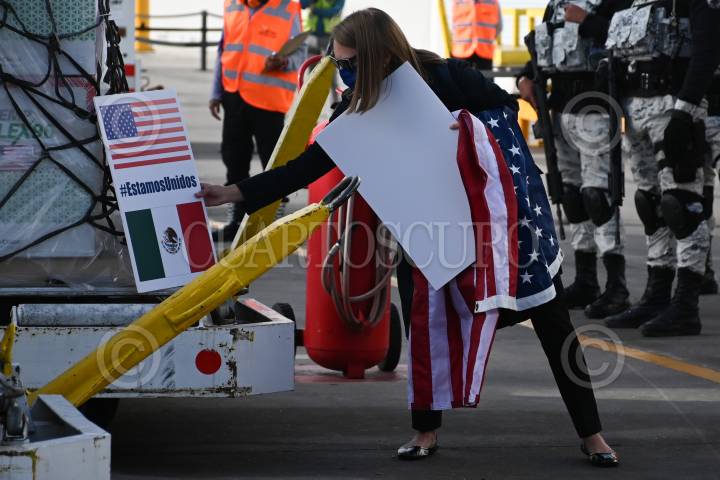 Una trabajadora de la. Embajada de Estados Unidos coloca un letrero sobre el cargamento de la vacuna contra el Covid-19 Moderna con las banderas de México y Estados Unidos