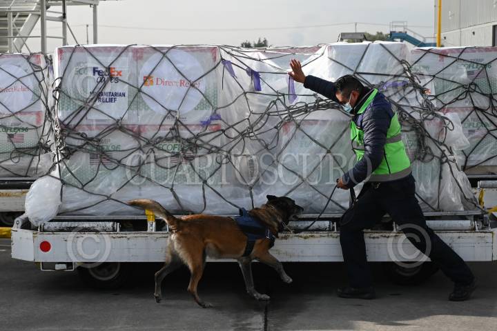 Un perro olfatea el cargamento de las vacunas contra el Covid-19.