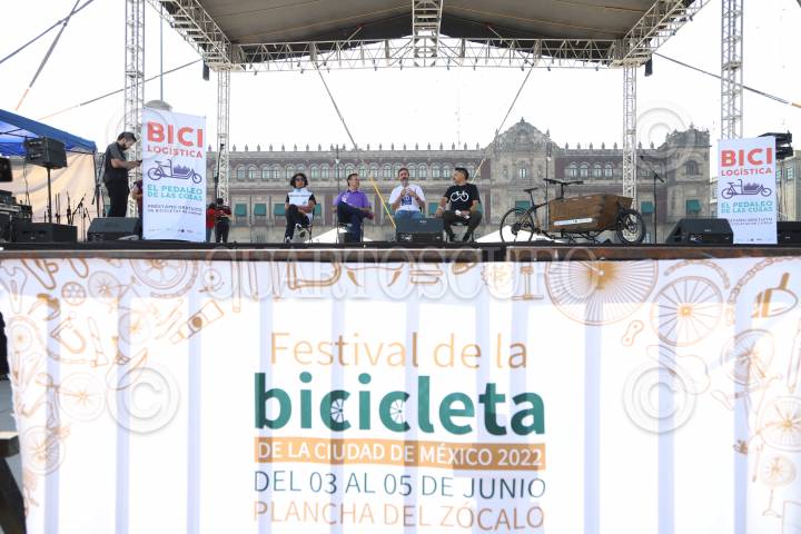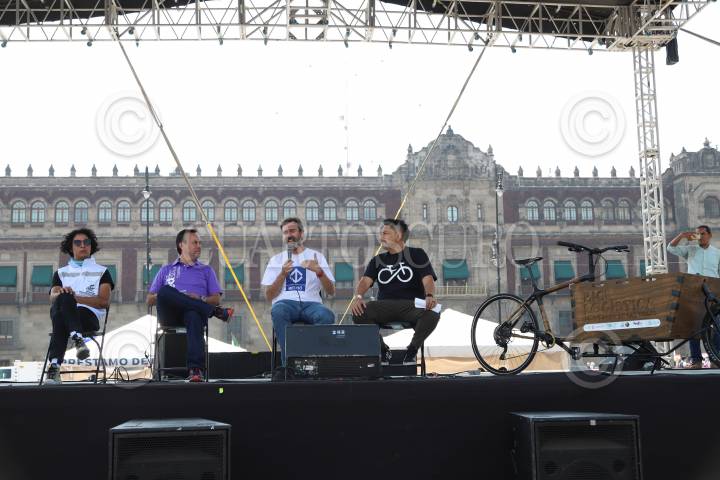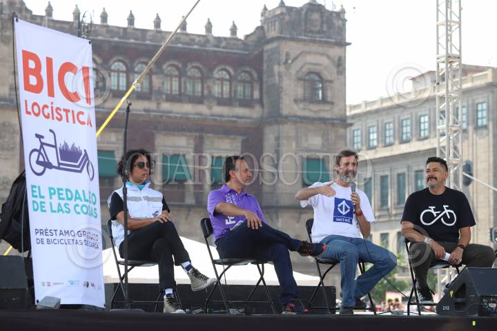 Jesús Pequeiros; Adrián García, representante de FedEx Exprés; Rodrigo Díaz, subsecretario de Semovi y Agustín Martínez Monterrubio de Biciteca en conferencia para presentar el programa “Bicilogística: el pedaleo de las cosas”, que consiste en el préstamo de bicicletas de carga. En el marco del Festival de la Bicicleta 2022 en el zócalo capitalino.