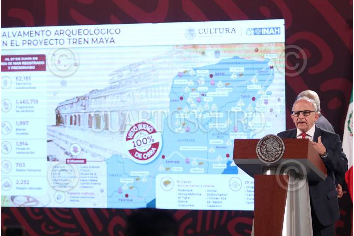CIUDAD DE MÉXICO, 27JUNIO2024.- Diego Prieto Hernández, director general del Instituto Nacional de Antropología e Historia (INAH) durante conferencia de prensa matutina en Palacio Nacional. FOTO: ANDREA MURCIA /CUARTOSCURO.COM