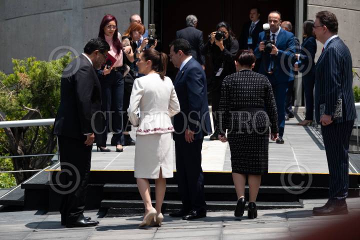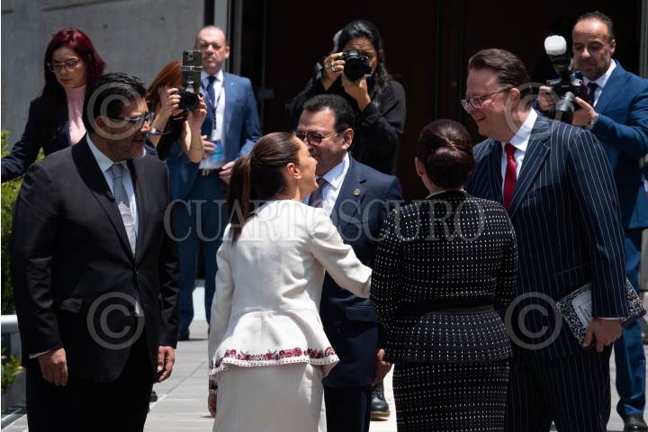 CIUDAD DE MÉXICO, 15AGOSTO2024.- Los magistrados Tribunal Electoral del Poder Judicial de la Federación (TEPJF) Reyes Rodríguez Mondragón, Felipe Alfredo Fuentes Barrera, y Felipe de la Mata Pizaña recibieron a Claudia Sheinbaum Pardo, virtual presidenta electa de México, en la Sala Superior del TEPJF para hacerle entrega de su constancia de mayoría que la acreditada como la presidenta electa de la República. FOTO: GALO CAÑAS/CUARTOSCURO.COM