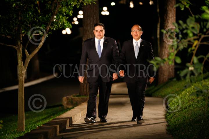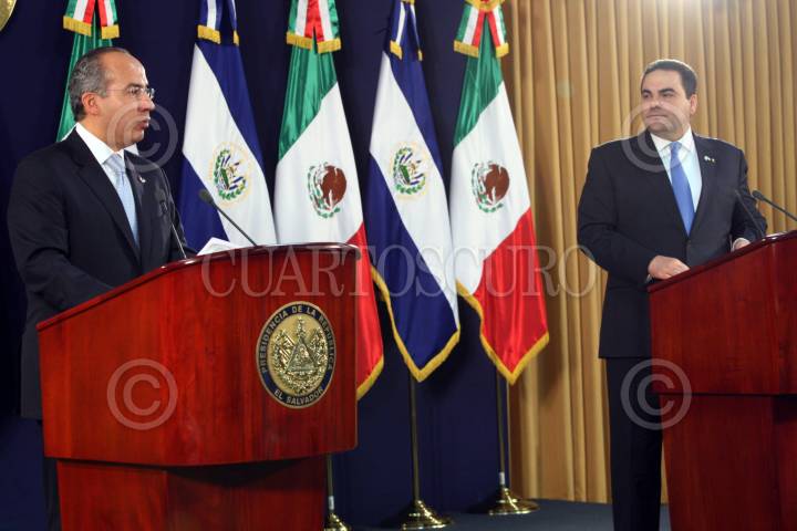 SAN SALVADOR ,REPUBLICA DE EL SALVADOR,04 MARZO 2008.. El presidente Felpe Calderon Hinojosa , durante la reunión bilateral con el presidente de la república del Salvador Elias Antonio Saca. la cual tuvo lugar en el salon de consejo de ministros de la casa presidencial. FOTO: ALFREDO GUERRERO/CUARTOSCURO.COM