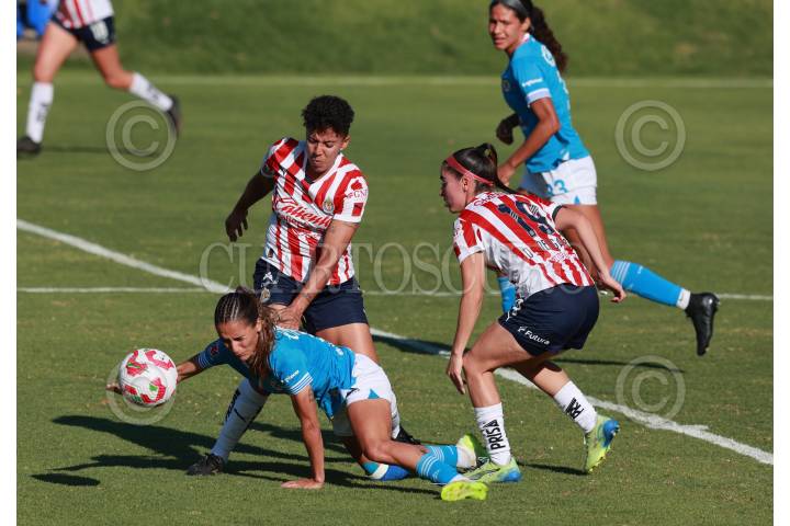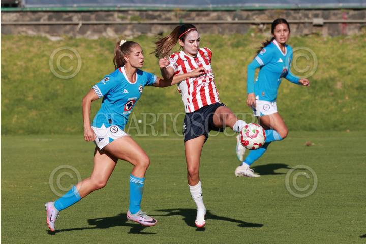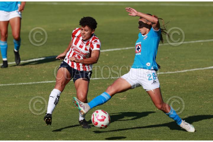 CIUDAD DE MÉXICO, 21ENERO2024. Angélica Torres de las Chivas y Aerial Chavarin de las Celestes disputan una pelota durante el partido de fútbol Cruz Azul vs Guadalajara correspondiente a la jornada 4 del Torneo Clausura 2025 de Liga BBVA MX Femenil, en instalaciones de La Noria. FOTO: EDGAR NEGRETE LIRA/CUARTOSCURO.COM