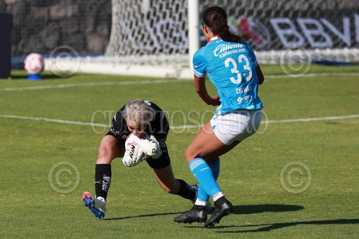 CIUDAD DE MÉXICO, 21ENERO2024. La portera Blanca Félix se queda con el balón a la llegada de Aerial Chavarin de la Maquina durante el partido de fútbol Cruz Azul vs Guadalajara correspondiente a la jornada 4 del Torneo Clausura 2025 de Liga BBVA MX Femenil, en instalaciones de La Noria. FOTO: EDGAR NEGRETE LIRA/CUARTOSCURO.COM