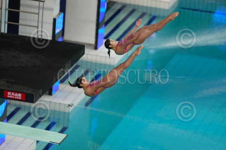 ZAPOPAN, JALISCO. 05ABRIL2025.- Hoy en el Centro Acuático Metropolitano y durante la justa deportiva del Mundial de Clavados Guadalajara 2025, se llevo a cabo la final en trampolín de 3 metros sincronizado femenil, en donde las mexicanas Mia y Lia Cueva Lobato se llevaron la medalla de plata. FOTO: FERNANDO CARRANZA GARCIA / CUARTOSCURO.COM