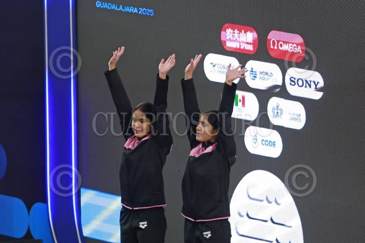 ZAPOPAN, JALISCO. 06ABRIL2025.- Hoy en el Centro Acuático Metropolitano y durante la justa deportiva del Mundial de Clavados Guadalajara 2025, se llevo a cabo la final en Plataforma de 10 metros Sincronizado femenil, en donde las mexicanas Alejandra Estudillo y Gabriela Agundez terminaron en 2da posición durante la competencia, consiguiendo así la medalla de plata. FOTO: FERNANDO CARRANZA GARCIA / CUARTOSCURO.COM