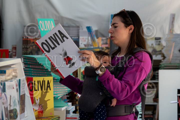 Una madre con su bebé al pecho observa el libro ilustrado de Olivia durante el primer día de la FILIJ en el Bosque de Chapultepec.