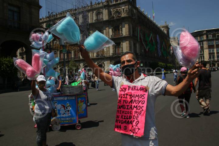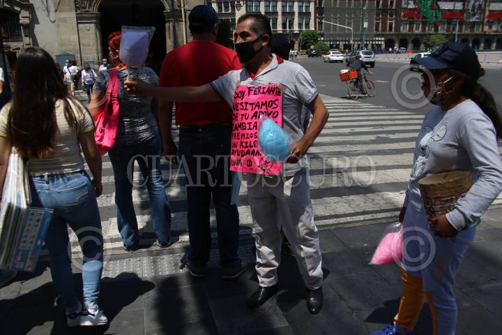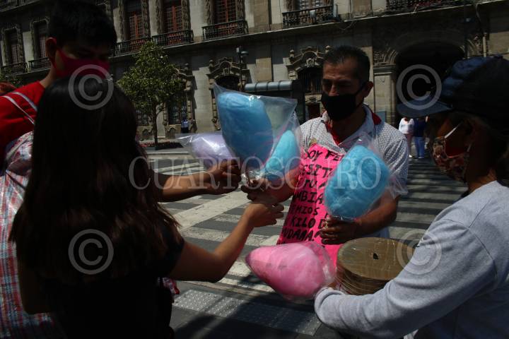 Trabajadores de ferias pidieron ayuda económica a la gente que transitaba en el Zócalo a cambio les regalaban un algodón de azúcar.