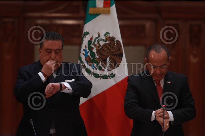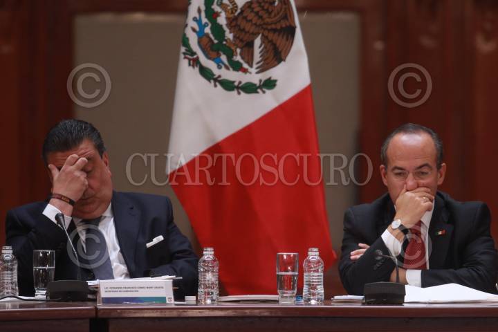 MÉXICO, D.F., 02JUNIO2009.- Fernado Gómez-Mont, Secretario de Gobernación, acompañado por Felipe Calderón Hinojosa, Presidente de México, durante la XXVI sesión del Consejo Nacional de Seguridad Pública en Palacio Nacional, encabezada por el mandatario mexicano. FOTO: SÁSHENKA GUTIÉRREZ/CUARTOSCURO.COM