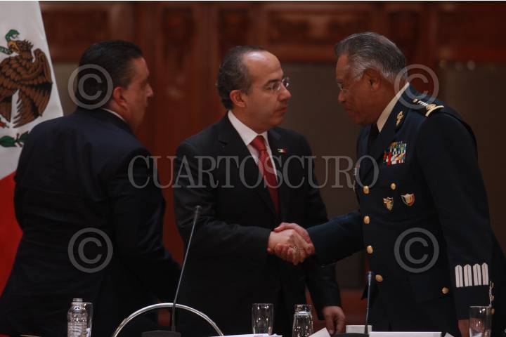 MÉXICO, D.F., 02 JUNIO2009.- Fernado Gomez Mont Secretario de Gobernación acompañado por Felipe Calderón Hinojosa Presidente de México saluda a Guillermo Galvan Galvan Secretario de la SEDENA durante la XXVI sesión del Consejo Nacional de Seguridad Pública en Palacio Nacional encabezada por el mandatario mexicano FOTO: SÁSHENKA GUTIÉRREZ/CUARTOSCURO.COM