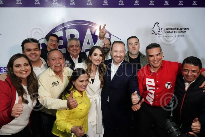 CIUDAD DE MÉXICO, 21ABRIL2024.- Santiago Taboada, candidato a Jefe de Gobierno por el PRI-PAN-PRD, acompañado de su esposa Fernanda Chávez, Jesús Zambrano, presidente del PRD, y Alejandro Moreno, presidente del PRI, durante su salida del Segundo Debate Chilango en las instalaciones del Grupo MVS. FOTO: GRACIELA LÓPEZ /CUARTOSCURO.COM