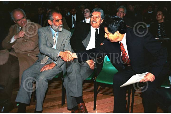 El presidente de la mesa directiva del Senado, Enrique Jackson, saluda al Presidente Fox antes de inagurar el Seminario Internacional "El crecimiento económico y la Globalización". Atestiguan el saludo el senador Diego Fernández de Cevallos y el gobernador del Banco de México, Guillermo Ortíz. FOTO: Juan Pablo Zamora/CUARTOSCURO.COM