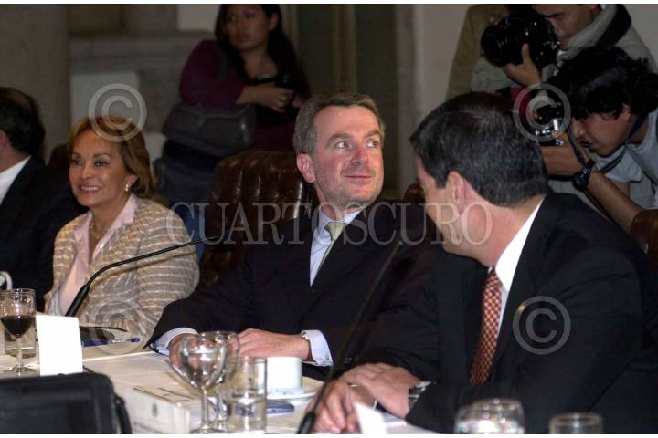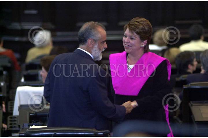 Diego Fernández de Cevallos bromea con la Diputada Beatriz Paredes, momentos antes de iniciar el anuncio del Programa Nacional de Procuración de Justicia 2001-2006. FOTO: Pedro Mera/CUARTOSCURO.COM