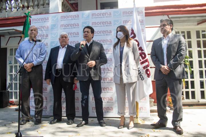 Fernando Ábrego, Mario Fernández, Mario Delgado, Clara Luz Flores, y Rafael Zarazúa, durante la conferencia de prensa en la cual hablaron sobre los mecanismos que implementará Morena para elegir a su candidato a la gubernatura de Nuevo León.