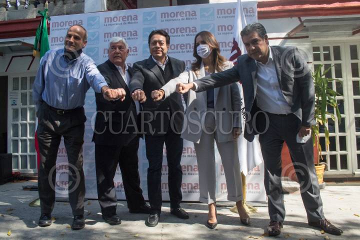 Fernando Ábrego, Mario Fernández, Mario Delgado, Clara Luz Flores, y Rafael Zarazúa, posan con el puño al frente al finalizar la conferencia de prensa en la cual se definieron los mecanismos que implementará Morena para elegir a su candidato a la gu