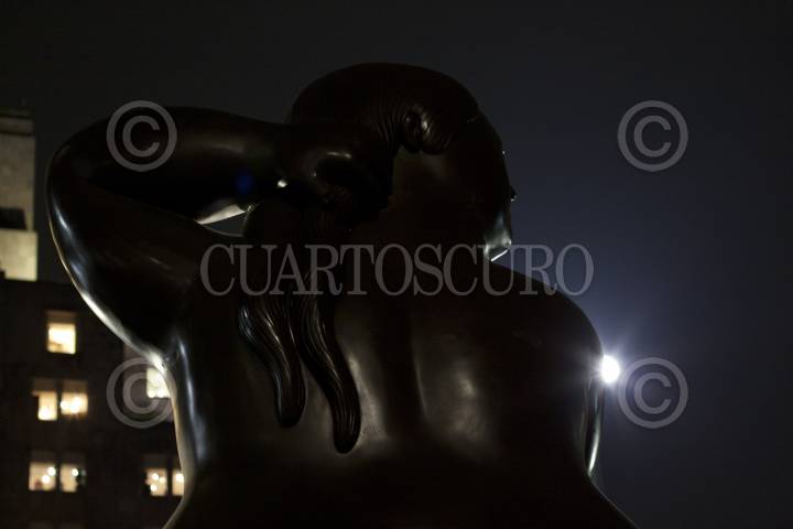 MÉXICO, D.F., 29MARZO2012.- Con la luz nocturna se acentúan la sensualidad de las formas en la esculturas de Fernando Botero que están en el patio del Palacio de Bellas Artes, las cuales forman parte de la exposición del colombiano que se encuentra en el interior del recinto. El artista ha señalado que a pesar de que mucha gente lo identifica como el "escultor de las gordas", a él solo le interesa el volumen, la proporción de las formas, la sinuosidad y sensualidad de la curvas, en su obra plástica. FOTO: MOISÉS PABLO /CUARTOSCURO.COM