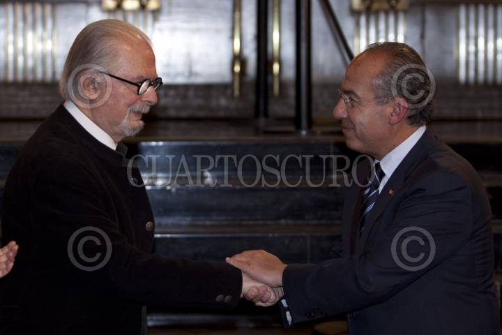 MÉXICO, D.F., 29MARZO2012.- El pintor colombiano Fernando Botero acompañado del presidente Felipe Calderón durante el evento de inauguración de su exposición en el Palacio de Bellas Artes en donde se exhiben 177 piezas y estará abierta al público hasta el mes de junio. FOTO: RODOLFO ANGULO /CUARTOSCURO.COM