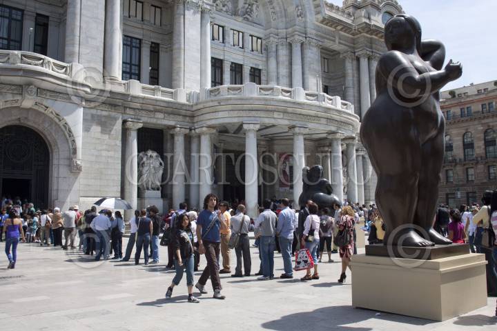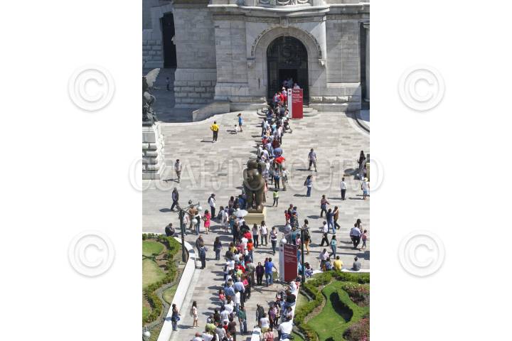 MÉXICO, D.F., 04ABRIL2012.- Largas filas de personas se aprecian para ingresar al Palacio de Bellas Artes en donde se albergan 177 piezas de la muestra “Fernando Botero: Una celebración", además de que los paseantes pueden admirar las cinco esculturas monumentales que se ubican en la explanada del mencionado recinto. FOTO: MOISÉS PABLO /CUARTOSCURO.COM