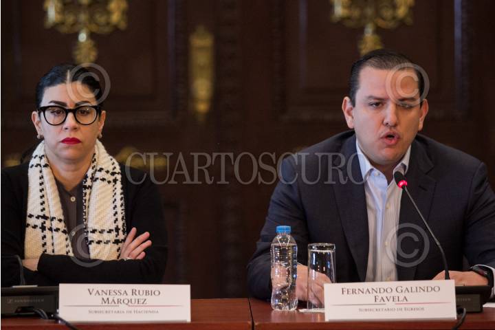 CIUDAD DE MÉXICO, 14ENERO2018.- Vanessa Rubio Márquez, subsecretaria de Hacienda, y Fernando Galindo Favela, subsecretario de Egresos, durante el mensaje a medios para esclarecer las acusaciones de Javier Corral, gobernador de Chihuahua, respecto al otorgamiento de recursos para el estado. FOTO: GALO CAÑAS /CUARTOSCURO.COM