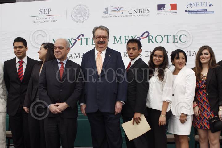 MÉXICO, D.F., 24JULIO2014.- Alain Bourdon, consejero cultural de la embajada francesa y Fernando Serrano Migallon, subsecretario de educación superior de la SEP, durante la ceremonia para entregar las becas a los alumnos que se irán a estudiar a Francia. FOTO: MOISÉS PABLO /CUARTOSCURO.COM