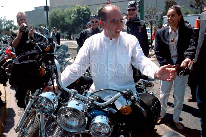 MEXDF31MAR2001: Jorge Castañeda Secretario de Relaciones Exteriores y Fernando Canales Clariond gobernador de Nuevo Leon dieron el banderazo para que un grupo de empresarios finlandeses aficionados al motociclismo realizen una gira por nuestro pais para promover inversiones. FOTO:Oswaldo Ramirez/CUARTOSCURO.COM