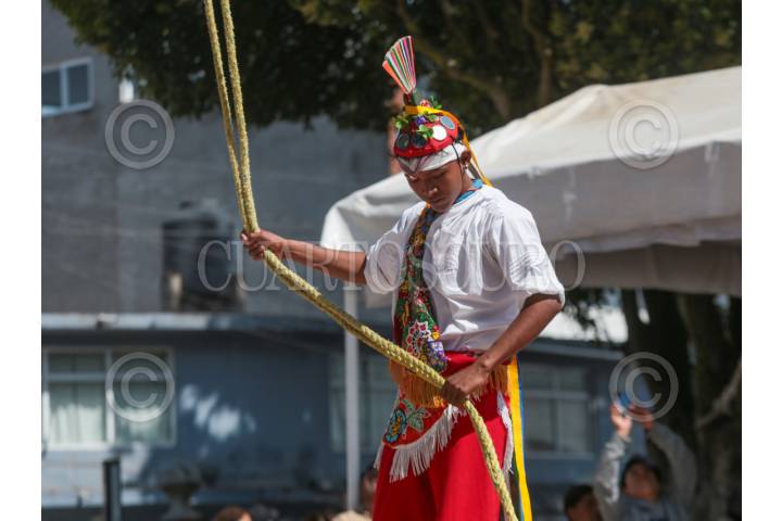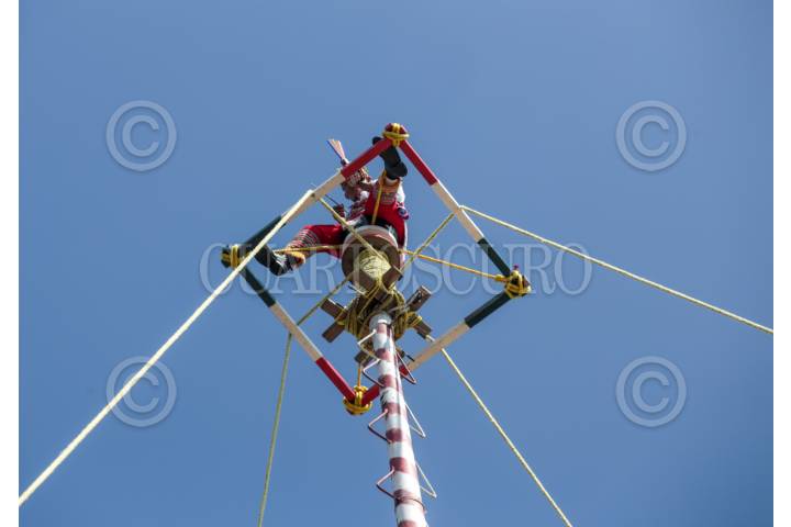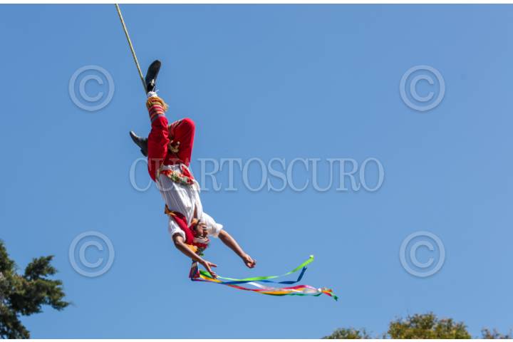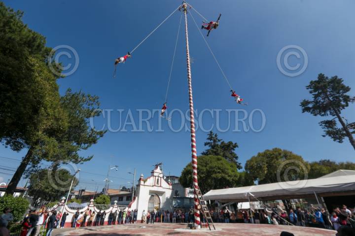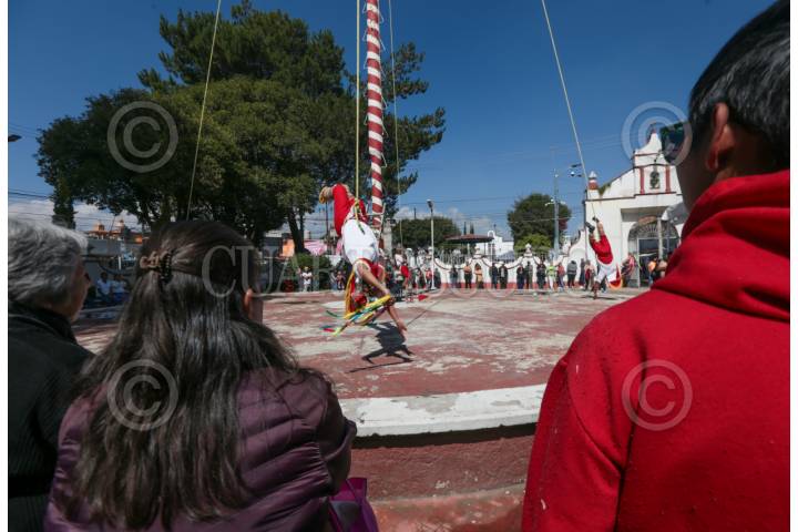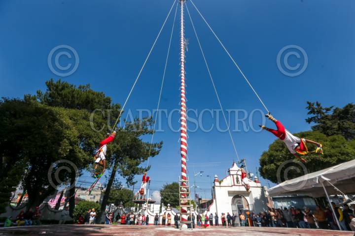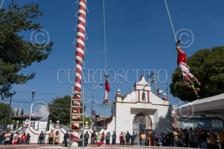 TOLUCA, ESTADO DE MÉXICO, 03JULIO2025.- Como parte de los festejos patronales de San Lorenzo Tepaltitlán en Toluca se presentan Voladores de Papantla en el atrio de la iglesia principal, vecinos y visitantes observan este espectáculo con gran entusiasmo. FOTO: CRISANTA ESPINOSA AGUILAR/CUARTOSCURO.COM