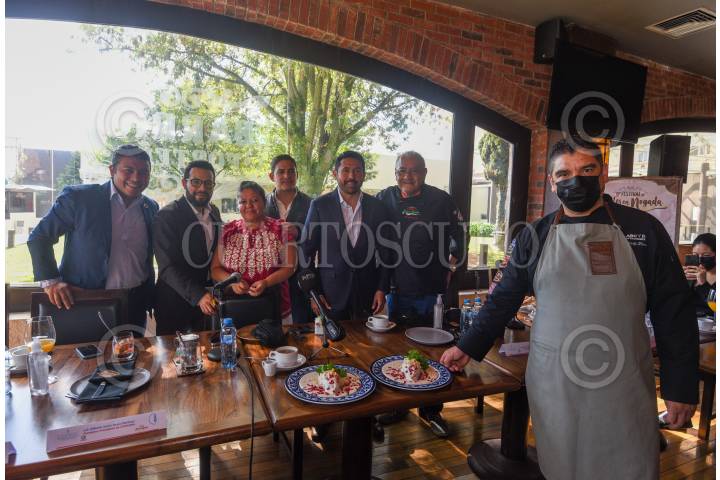 Mauricio Massud, presidente de CANIRAC Edoméx, Alejandro León Balderas, presidente del 9vo Festival de Chiles en Nogada, Gilberto Sauza líder de CONCAEM, Cheff Guillermo Cruz Ponce Presidente Fundador del 9vo Festival de Chiles en Nogada y Presidente del Claustro Gastronómico de los Volcanes y Griselda Hurtado Presidenta de CANIRAC Cuernavaca en conferencia de prensa anunciaron la realización del Noveno Festival de Chiles en Nogada en el Estado de México.
