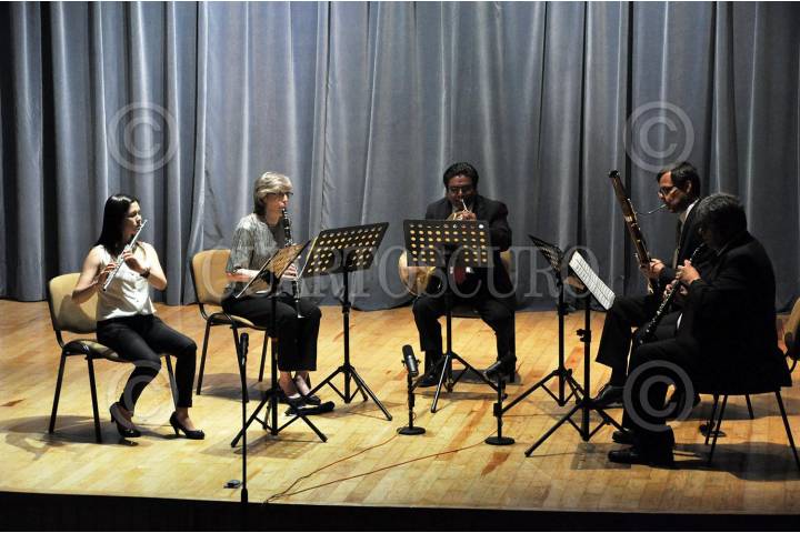 ZACATECAS, ZACATECAS, 29MARZO2016.- Dentro de las actividades del trigésimo Festival Cultural Zacatecas 2016 se presento el quinteto de vientos Cuicari EEUU-México integrado por los músicos; Yamani Fuentes. flauta; Miguel Salazar, oboe; Eleonor Weingartner, clarinete; David Ball, fagot, y Silvestre Hernández, corno francés. El recital se realizó en el Auditorio del Museo Manuel Felguérez, FOTO: CARLOS SEGURA /CUARTOSCURO.COM