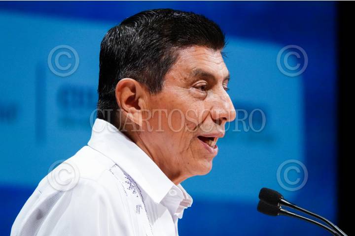 CIUDAD DE MÉXICO, 16JULIO2024.- Salomón Jara, gobernador de Oaxaca, durante la conferencia de prensa en el Palacio de Bellas Artes para dar a conocer detalles sobre la edición 52ª del Festival Internacional Cervantino (FIC), así las actividades culturales y los invitados de este año que corresponden a Oaxaca y Brasil. FOTO: GALO CAÑAS/CUARTOSCURO.COM