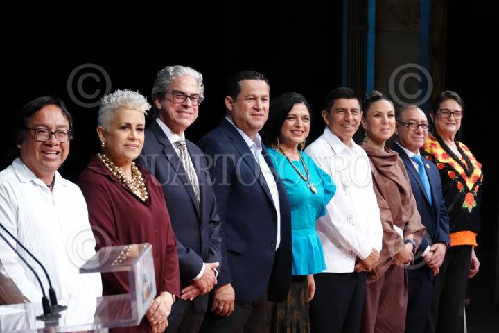 CIUDAD DE MÉXICO, 16JULIO2024.- Eugenia León, cantante y artista invitada; Fernando Estellita Lins de Salvo Coimbra, embajador de Brasil en México; Diego Sinhue, gobernador de Guanajuato; Alejandra Frausto, secretaria de Cultura; Salomón Jara, gobernador de Oaxaca, y Mariana Aymerich, directora del Festival Internacional Cervantino (FIC), durante la conferencia de prensa en el Palacio de Bellas Artes para dar a conocer detalles sobre la edición 52ª del FIC, así las actividades culturales y los invitados de este año que corresponden a Oaxaca y Brasil. FOTO: GALO CAÑAS/CUARTOSCURO.COM