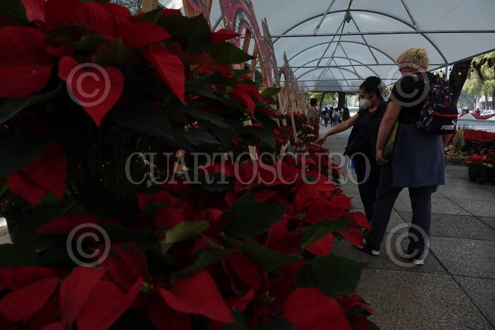 Un joven transita por los stand con flores de nochebuena que comenzó su festival sobre Paseo de la Reforma