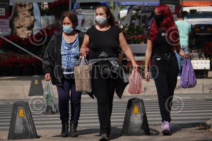 Tres mujeres se retiran tras comprar flores de nochebuena que comenzó su festival sobre Paseo de la Reforma