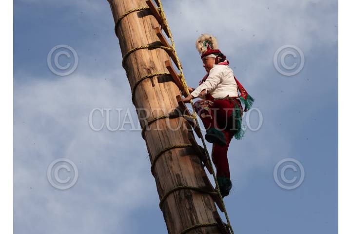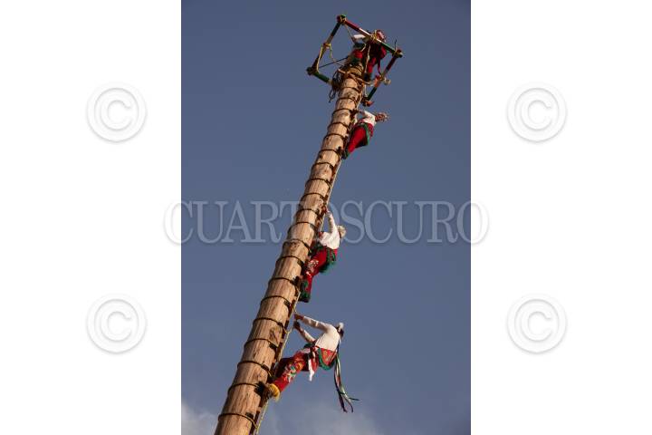 Voladora de Papantla sube el tronco durante la Ceremonia de Voladores de Atempan, Puebla, en el Festival de la Primavera, realizado en el Centro Cultural Los Pinos
