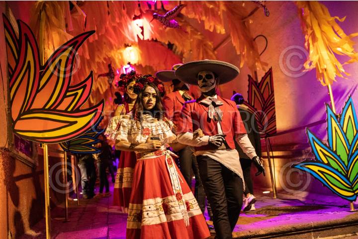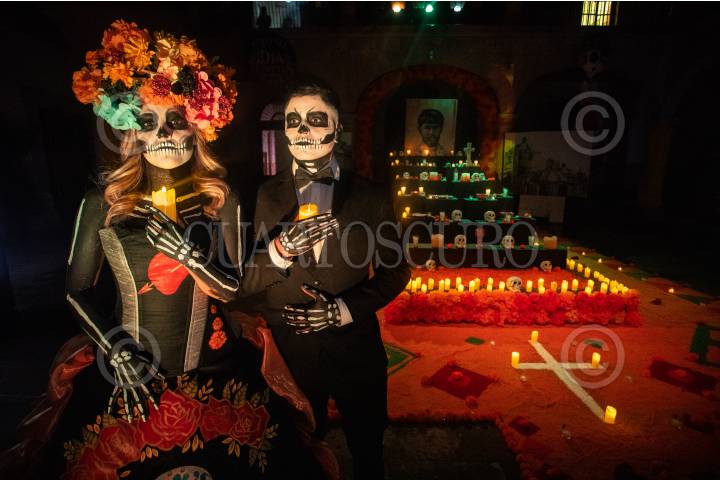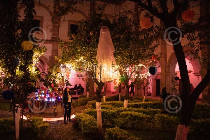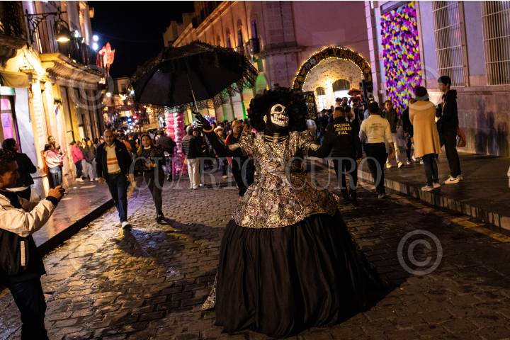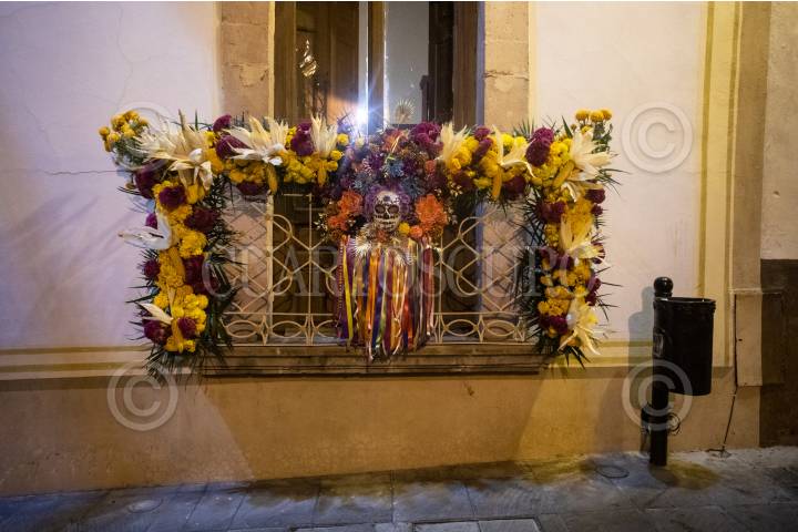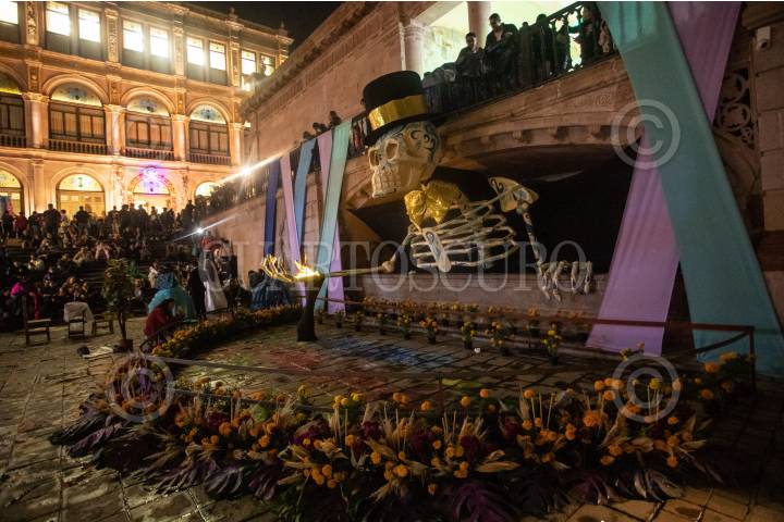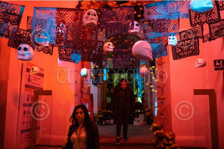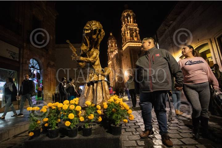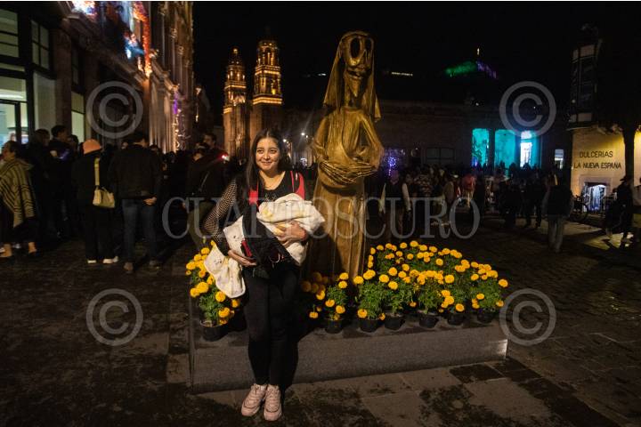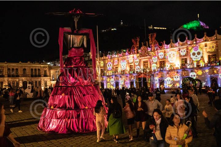 ZACATECAS, ZACATECAS, 30OCTUBRE2023.- Fue inaugurado el festival de Día de Muertos 2023 en las principales calles del Centro Histórico. Cientos de zacatecanos se dieron cita para ser parte de escenas en los pórticos y fachadas de plazas, plazuelas, museos y edificios, principalmente aquellos que fungen como negocios, fueron adornados con flores, fotografías, papel picado y gran variedad de ofrendas. FOTO: ADOLFO VLADIMIR /CUARTOSCURO.COM