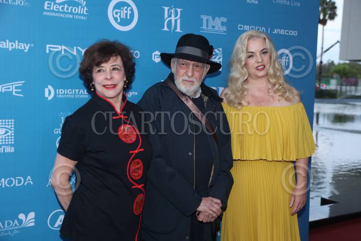LEÓN, GUANAJUATO, 20JULIO2024. Sarah Hoch, Silvia Pasquel y Horacio Castelo a su paso por la alfombra roja para el homenaje al director Arturo Ripstein por parte del Festival Internacional de Cine de Guanajuato (GIFF) en su edición número 27, en el Teatro Bicentenario. FOTO: EDGAR NEGRETE LIRA/CUARTOSCURO.COM